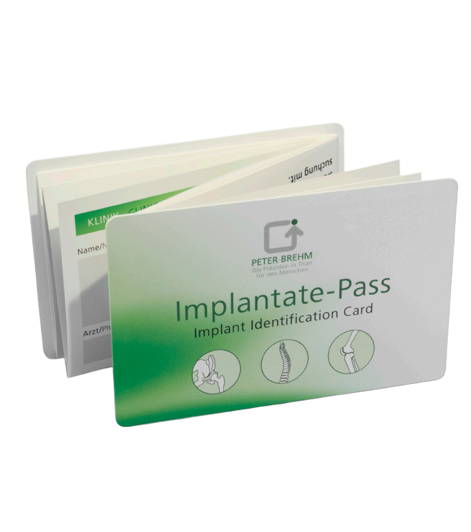 Bei jeder Operation, in welcher der Patient ein künstliches Implantat erhält, wird ein Ausweis ausgestellt. Der sogenannte Implantate-Pass (Abb. 3) beinhaltet neben Personendaten Angaben zum Operationstag, der betroffenen Extremität und dem verwendeten Implantat. Hiermit können Sie sich unter anderem am Flughafen bei der Kontrolle durch Metalldetektoren ausweisen. Der Ausweis ist zu jeder ärztlichen Vorstellung mitzubringen, da der Arzt dadurch wichtige Informationen erhält.