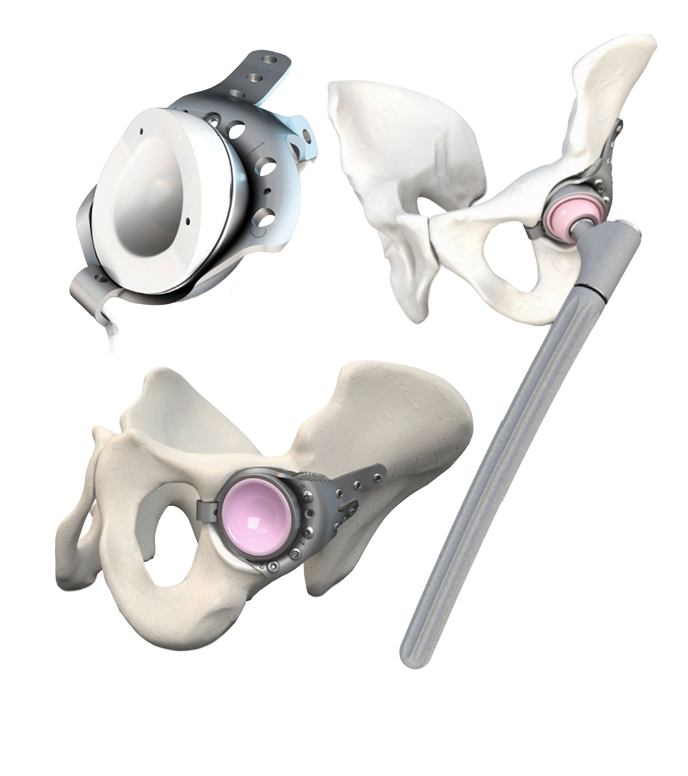 Bei großen knöchernen Defektsituationen primär oder im Zustand nach multiplen Eingriffen muss sowohl die Pfannen- als auch die Schaftkomponente individuell gefertigt werden. Für den Prothesenwechsel (Revision) stehen andere Pfannendesigns wie Ringe oder Pfannen mit Schraubsystemen zur Verfügung. Ebenfalls können die Schaftlängen wie auch die Schaftverankerungen variieren (Abb. 2)
