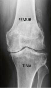 Das Kniegelenk funktioniert ähnlich wie ein Scharniergelenk, bestehend aus dem Oberschenkelknochen (Femur), dem Schienbein (Tibia) und der Kniescheibe (Patella), die jeweils mit Knorpel auf der Gelenkfläche überzogen sind. Das Wadenbein (Fibula) ist nicht direkt an den Gelenkflächen beteiligt, ist jedoch Ansatzpunkt des äußeren Seitenbandes (Abb. 1). Wir unterscheiden 3 Gelenkanteile, wo sich eine Arthrose ausbilden kann. Im Mittelpunkt steht hierbei die Verbindung zwischen Schienbein und Oberschenkel (=Tibiafemoralgelenk) bzw. zwischen dem Oberschenkelknochen und der Rückfläche der Kniescheibe (=Femoropatellargelenk).