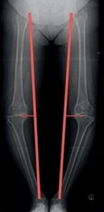 Unfallbedingte Verletzungen des Gelenkes sowie längerfristige Über- und Fehlbelastung können zu einer Schädigung der Knorpeloberfläche mit fortschreitendem Gelenkverschleiß (Arthrose) führen. Die Kniegelenksarthrose bezeichnet der Arzt als „Gonarthrose“. Der menschliche Körper kann den Verlust des Knorpels nicht ersetzen. Achsfehlstellungen (Abb. 2) führen zu einem schnellen Fortgang des Erkrankungsbildes.